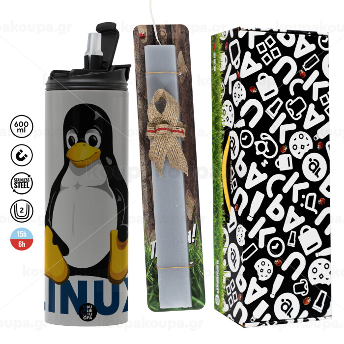 Linux, Πασχαλινή Λαμπάδα με Travel Tumbler θερμό (600ml, BPA free) & κερί αρωματικό πλακέ (30cm) (ΓΚΡΙ)
