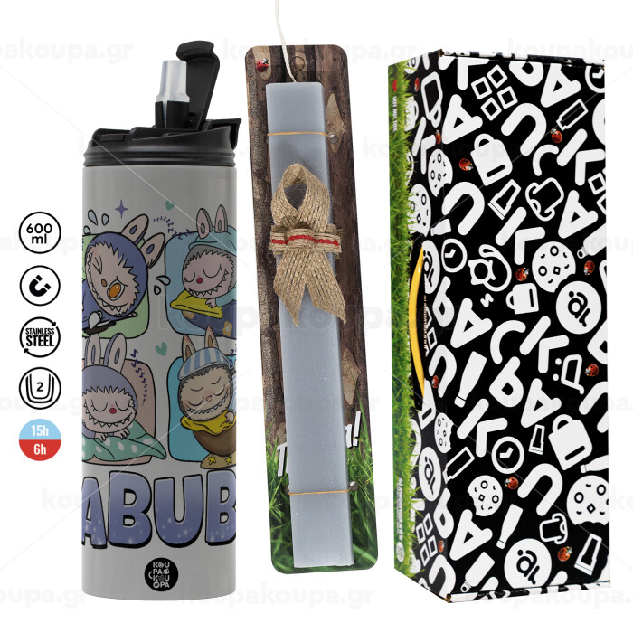 Labubu, Πασχαλινή Λαμπάδα με Travel Tumbler θερμό (600ml, BPA free) & κερί αρωματικό πλακέ (30cm) (ΓΚΡΙ)