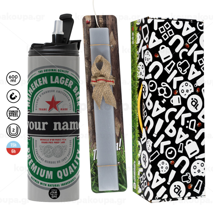 Heineken με όνομα, Πασχαλινή Λαμπάδα με Travel Tumbler θερμό (600ml, BPA free) & κερί αρωματικό πλακέ (30cm) (ΓΚΡΙ)