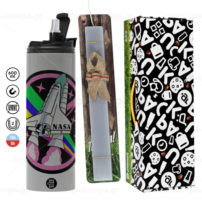 NASA pink, Πασχαλινή Λαμπάδα με Travel Tumbler θερμό (600ml, BPA free) & κερί αρωματικό πλακέ (30cm) (ΓΚΡΙ)