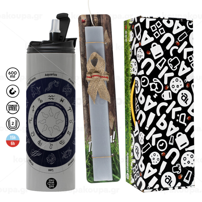 Ζωδιακός κύκλος, Πασχαλινή Λαμπάδα με Travel Tumbler θερμό (600ml, BPA free) & κερί αρωματικό πλακέ (30cm) (ΓΚΡΙ)