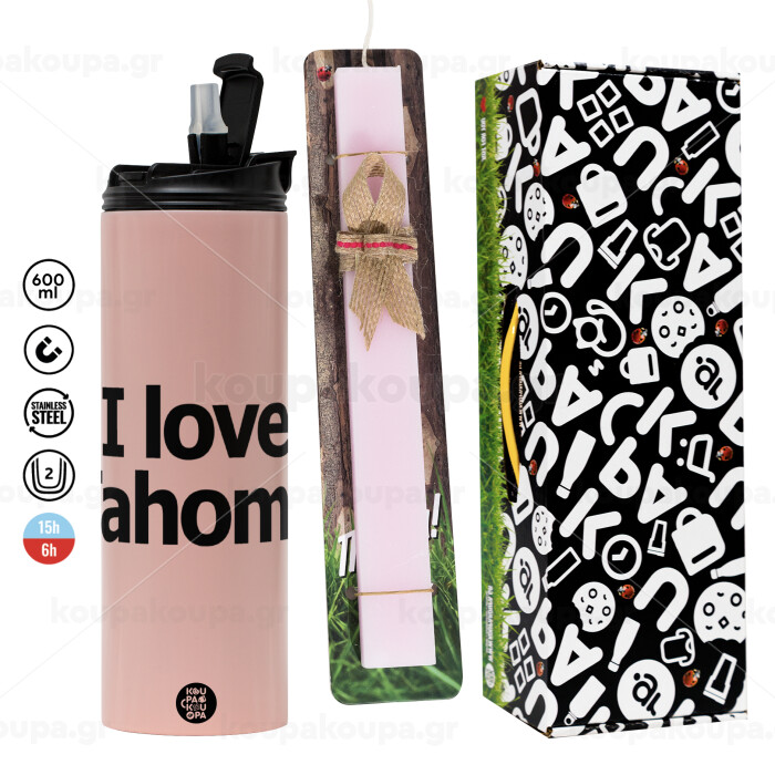 I love Tahoma, Πασχαλινή Λαμπάδα με ΡΟΖ Travel Tumbler θερμό (600ml, BPA free) & κερί αρωματικό πλακέ (30cm) (ΡΟΖ)