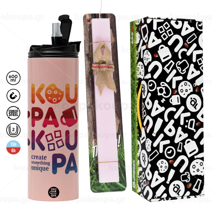 koupakoupa, Πασχαλινή Λαμπάδα με ΡΟΖ Travel Tumbler θερμό (600ml, BPA free) & κερί αρωματικό πλακέ (30cm) (ΡΟΖ)