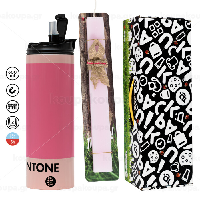 PANTONE Pink C, Πασχαλινή Λαμπάδα με ΡΟΖ Travel Tumbler θερμό (600ml, BPA free) & κερί αρωματικό πλακέ (30cm) (ΡΟΖ)