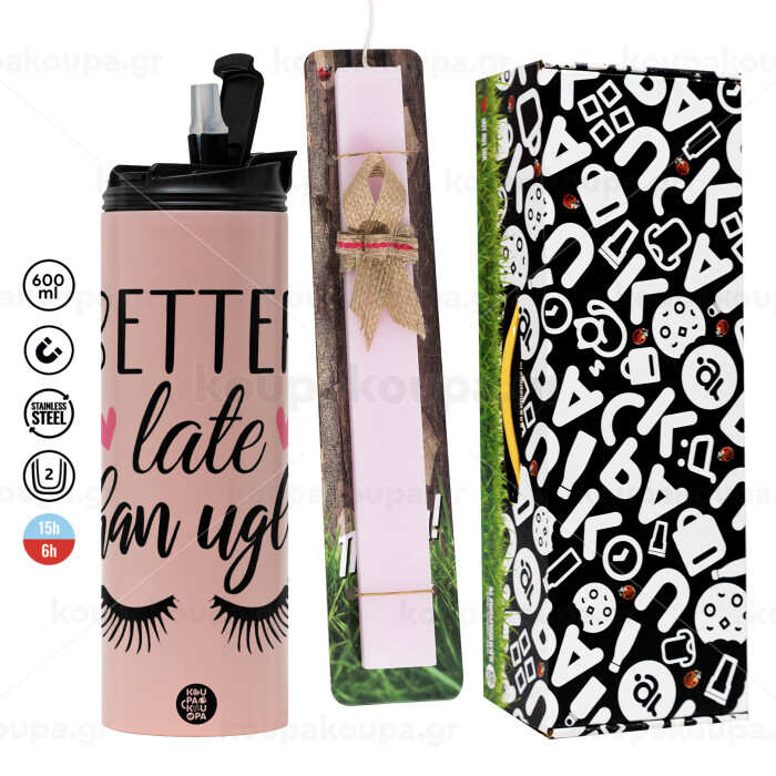 Better Late than ugly hearts, Πασχαλινή Λαμπάδα με ΡΟΖ Travel Tumbler θερμό (600ml, BPA free) & κερί αρωματικό πλακέ (30cm) (ΡΟΖ)