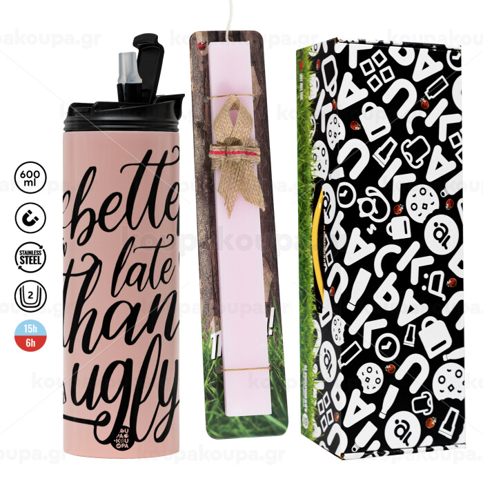 Better late than ugly, Πασχαλινή Λαμπάδα με ΡΟΖ Travel Tumbler θερμό (600ml, BPA free) & κερί αρωματικό πλακέ (30cm) (ΡΟΖ)