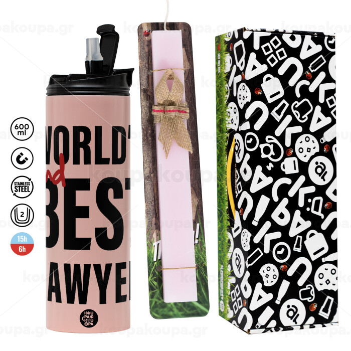 2nd, World Best Lawyer , Πασχαλινή Λαμπάδα με ΡΟΖ Travel Tumbler θερμό (600ml, BPA free) & κερί αρωματικό πλακέ (30cm) (ΡΟΖ)
