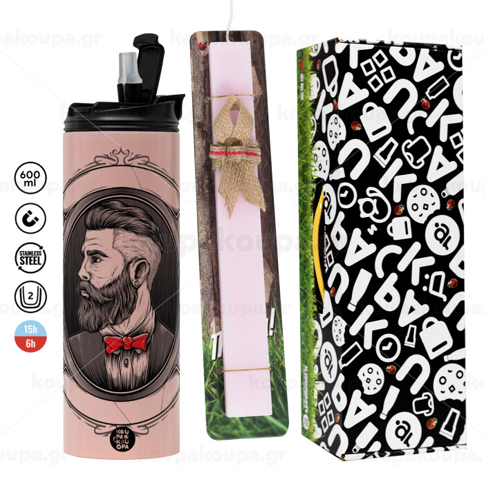 Barber shop, Πασχαλινή Λαμπάδα με ΡΟΖ Travel Tumbler θερμό (600ml, BPA free) & κερί αρωματικό πλακέ (30cm) (ΡΟΖ)