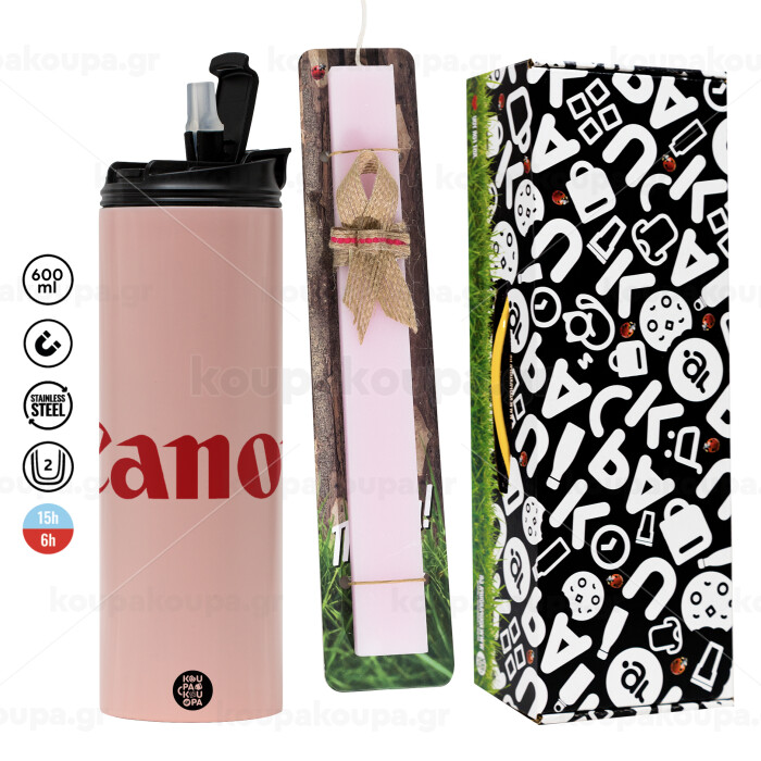 Canon, Πασχαλινή Λαμπάδα με ΡΟΖ Travel Tumbler θερμό (600ml, BPA free) & κερί αρωματικό πλακέ (30cm) (ΡΟΖ)