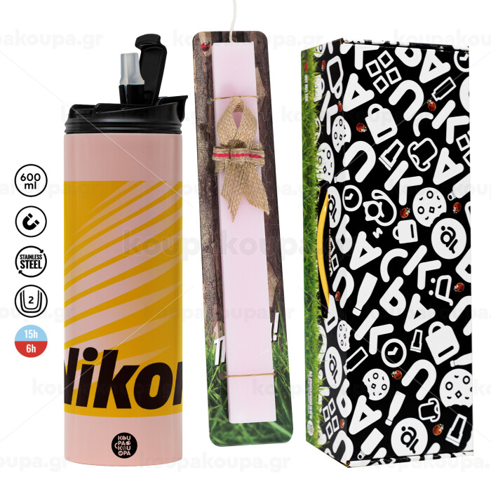 Nikon, Πασχαλινή Λαμπάδα με ΡΟΖ Travel Tumbler θερμό (600ml, BPA free) & κερί αρωματικό πλακέ (30cm) (ΡΟΖ)