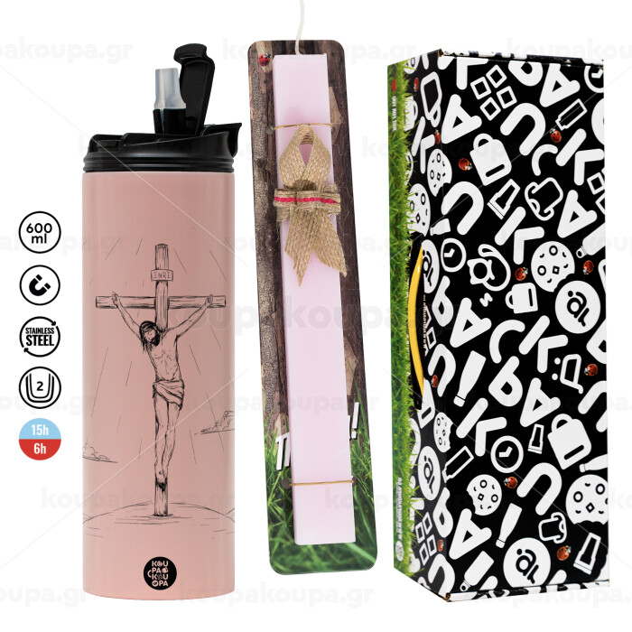 Jesus Christ , Πασχαλινή Λαμπάδα με ΡΟΖ Travel Tumbler θερμό (600ml, BPA free) & κερί αρωματικό πλακέ (30cm) (ΡΟΖ)