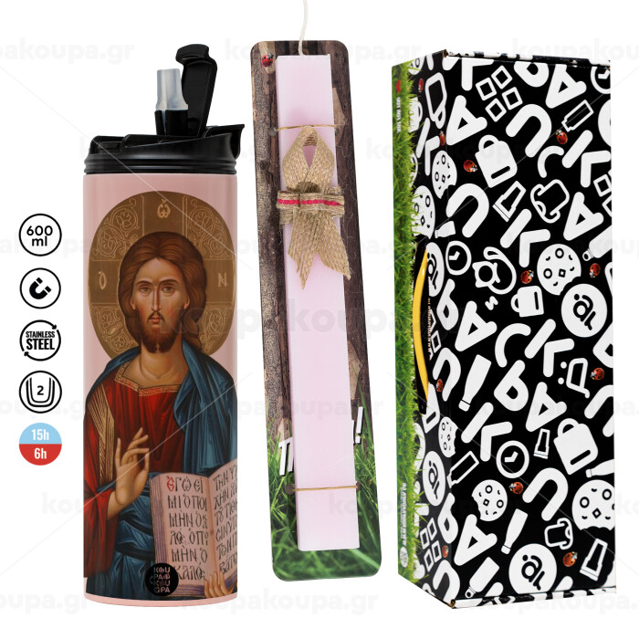 Ιησούς, Πασχαλινή Λαμπάδα με ΡΟΖ Travel Tumbler θερμό (600ml, BPA free) & κερί αρωματικό πλακέ (30cm) (ΡΟΖ)