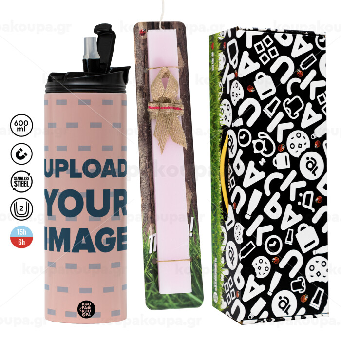 Το δικό σου σχέδιο, Πασχαλινή Λαμπάδα με ΡΟΖ Travel Tumbler θερμό (600ml, BPA free) & κερί αρωματικό πλακέ (30cm) (ΡΟΖ)