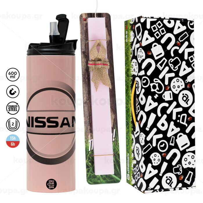 nissan, Πασχαλινή Λαμπάδα με ΡΟΖ Travel Tumbler θερμό (600ml, BPA free) & κερί αρωματικό πλακέ (30cm) (ΡΟΖ)