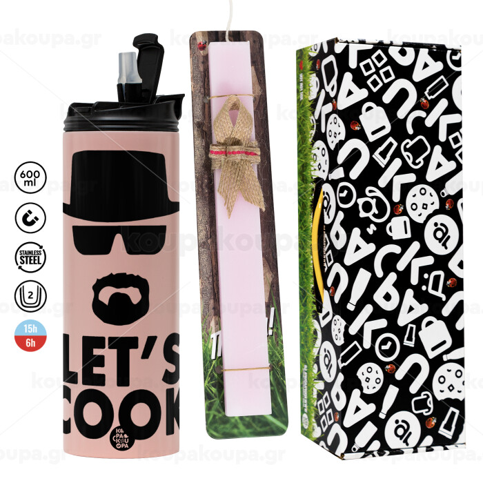 Let's cook, Πασχαλινή Λαμπάδα με ΡΟΖ Travel Tumbler θερμό (600ml, BPA free) & κερί αρωματικό πλακέ (30cm) (ΡΟΖ)