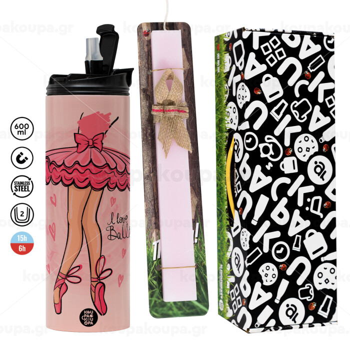 I Love Ballet, Πασχαλινή Λαμπάδα με ΡΟΖ Travel Tumbler θερμό (600ml, BPA free) & κερί αρωματικό πλακέ (30cm) (ΡΟΖ)