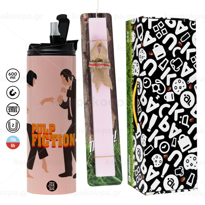 Pulp Fiction dancing, Πασχαλινή Λαμπάδα με ΡΟΖ Travel Tumbler θερμό (600ml, BPA free) & κερί αρωματικό πλακέ (30cm) (ΡΟΖ)
