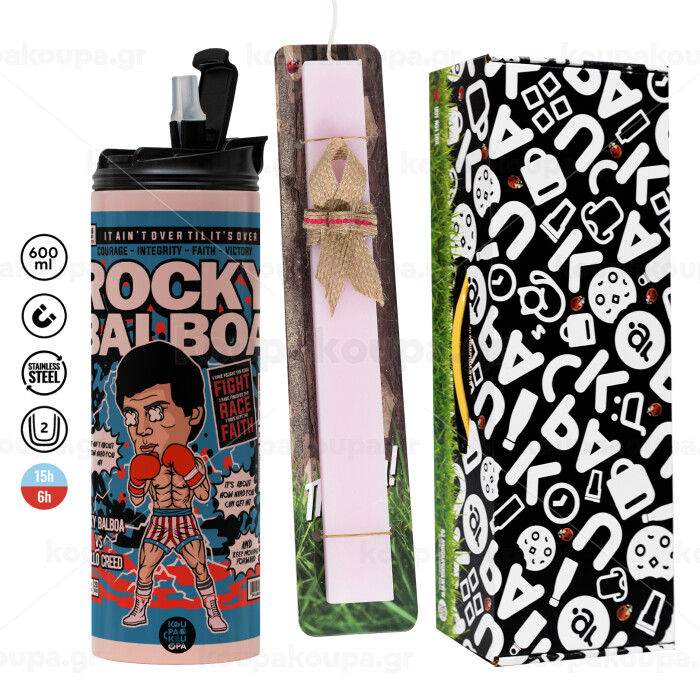 Rocky Balboa, Πασχαλινή Λαμπάδα με ΡΟΖ Travel Tumbler θερμό (600ml, BPA free) & κερί αρωματικό πλακέ (30cm) (ΡΟΖ)