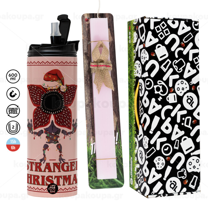 Stranger Things Christmas, Πασχαλινή Λαμπάδα με ΡΟΖ Travel Tumbler θερμό (600ml, BPA free) & κερί αρωματικό πλακέ (30cm) (ΡΟΖ)