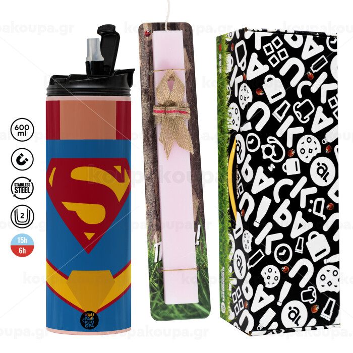 Superman flat, Πασχαλινή Λαμπάδα με ΡΟΖ Travel Tumbler θερμό (600ml, BPA free) & κερί αρωματικό πλακέ (30cm) (ΡΟΖ)