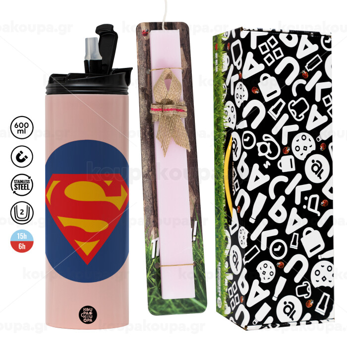Superman, Πασχαλινή Λαμπάδα με ΡΟΖ Travel Tumbler θερμό (600ml, BPA free) & κερί αρωματικό πλακέ (30cm) (ΡΟΖ)