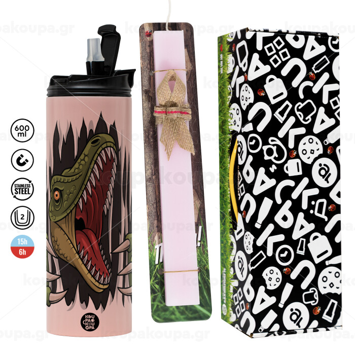 Dinosaur scratch, Πασχαλινή Λαμπάδα με ΡΟΖ Travel Tumbler θερμό (600ml, BPA free) & κερί αρωματικό πλακέ (30cm) (ΡΟΖ)
