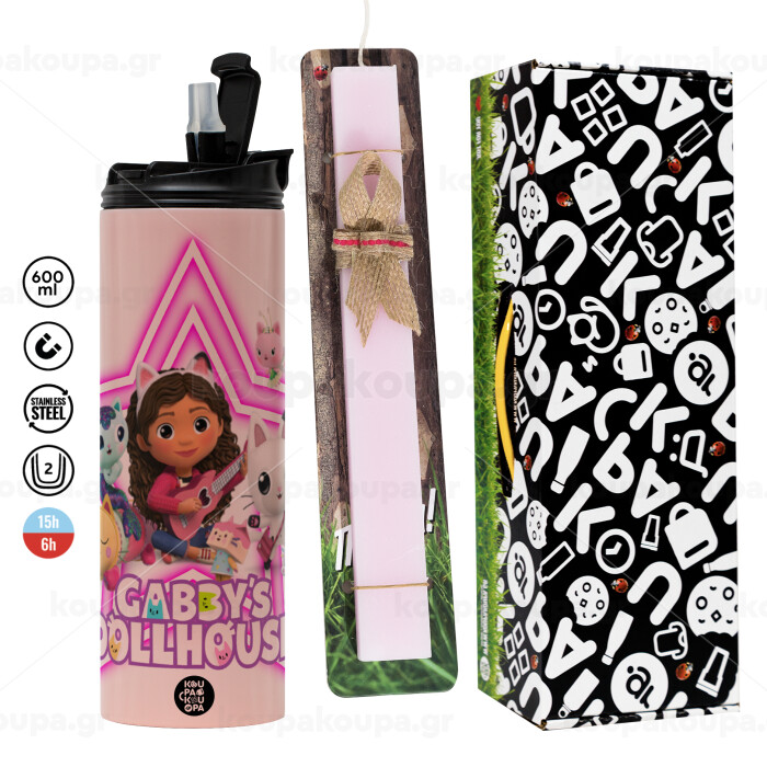 Gabby Dollhouse (ΤΟ ΚΟΥΚΛΟΣΠΙΤΟ ΤΗΣ ΓΚΑΜΠΙ), Πασχαλινή Λαμπάδα με ΡΟΖ Travel Tumbler θερμό (600ml, BPA free) & κερί αρωματικό πλακέ (30cm) (ΡΟΖ)