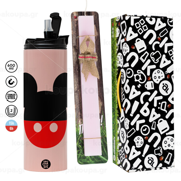 Mickey head, Πασχαλινή Λαμπάδα με ΡΟΖ Travel Tumbler θερμό (600ml, BPA free) & κερί αρωματικό πλακέ (30cm) (ΡΟΖ)