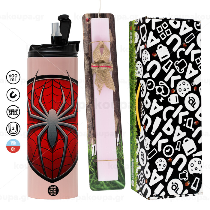 Spider-man, Πασχαλινή Λαμπάδα με ΡΟΖ Travel Tumbler θερμό (600ml, BPA free) & κερί αρωματικό πλακέ (30cm) (ΡΟΖ)