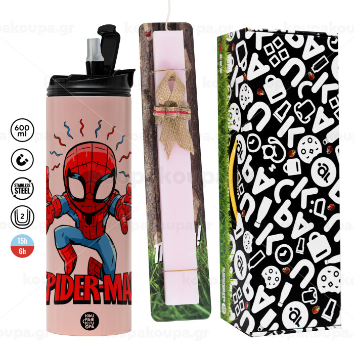 Spiderman flying, Πασχαλινή Λαμπάδα με ΡΟΖ Travel Tumbler θερμό (600ml, BPA free) & κερί αρωματικό πλακέ (30cm) (ΡΟΖ)