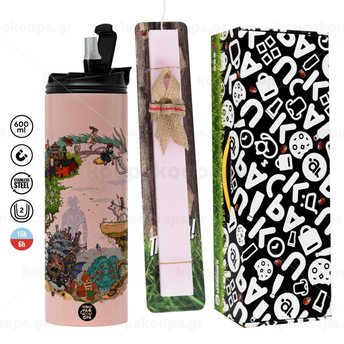 Στούδιο Γκίβλι, Πασχαλινή Λαμπάδα με ΡΟΖ Travel Tumbler θερμό (600ml, BPA free) & κερί αρωματικό πλακέ (30cm) (ΡΟΖ)