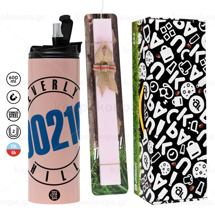Beverly Hills, 90210, Πασχαλινή Λαμπάδα με ΡΟΖ Travel Tumbler θερμό (600ml, BPA free) & κερί αρωματικό πλακέ (30cm) (ΡΟΖ)