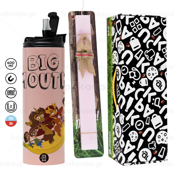 Big mouth, Πασχαλινή Λαμπάδα με ΡΟΖ Travel Tumbler θερμό (600ml, BPA free) & κερί αρωματικό πλακέ (30cm) (ΡΟΖ)