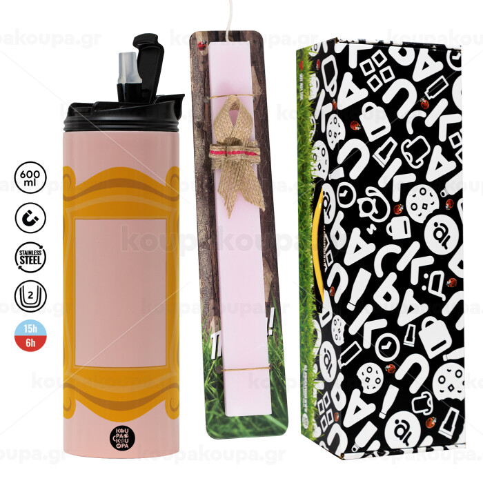 Friends frame, Πασχαλινή Λαμπάδα με ΡΟΖ Travel Tumbler θερμό (600ml, BPA free) & κερί αρωματικό πλακέ (30cm) (ΡΟΖ)