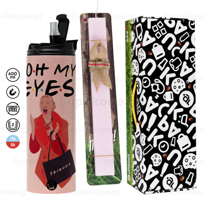 Friends,. oh my eyes Phoebe, Πασχαλινή Λαμπάδα με ΡΟΖ Travel Tumbler θερμό (600ml, BPA free) & κερί αρωματικό πλακέ (30cm) (ΡΟΖ)