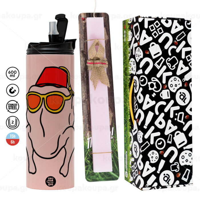 Friends turkey, Πασχαλινή Λαμπάδα με ΡΟΖ Travel Tumbler θερμό (600ml, BPA free) & κερί αρωματικό πλακέ (30cm) (ΡΟΖ)