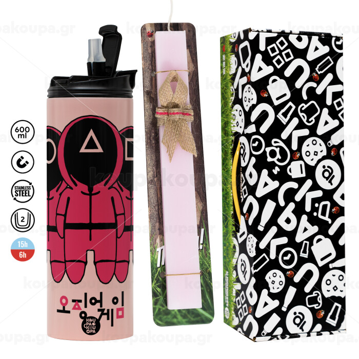 The squid game, Πασχαλινή Λαμπάδα με ΡΟΖ Travel Tumbler θερμό (600ml, BPA free) & κερί αρωματικό πλακέ (30cm) (ΡΟΖ)