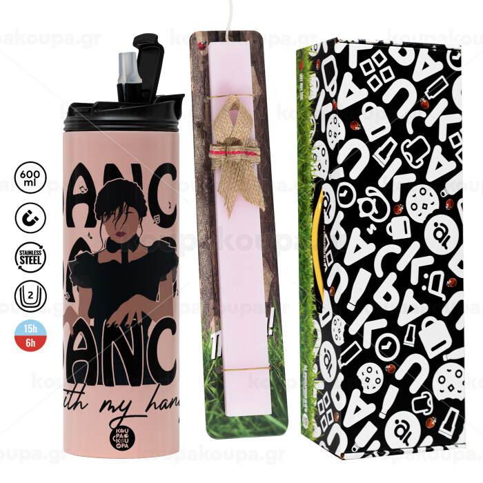 Wednesday dance dance dance, Πασχαλινή Λαμπάδα με ΡΟΖ Travel Tumbler θερμό (600ml, BPA free) & κερί αρωματικό πλακέ (30cm) (ΡΟΖ)
