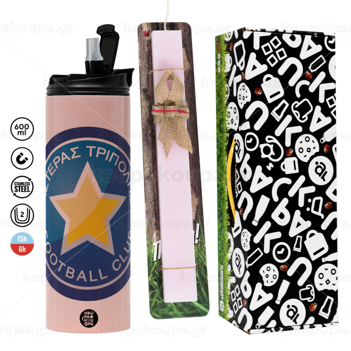 Αστέρας Τρίπολης, Πασχαλινή Λαμπάδα με ΡΟΖ Travel Tumbler θερμό (600ml, BPA free) & κερί αρωματικό πλακέ (30cm) (ΡΟΖ)