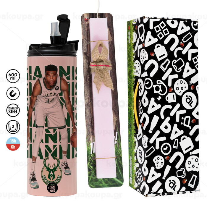 Γιάννης Αντετοκούνμπο, Πασχαλινή Λαμπάδα με ΡΟΖ Travel Tumbler θερμό (600ml, BPA free) & κερί αρωματικό πλακέ (30cm) (ΡΟΖ)