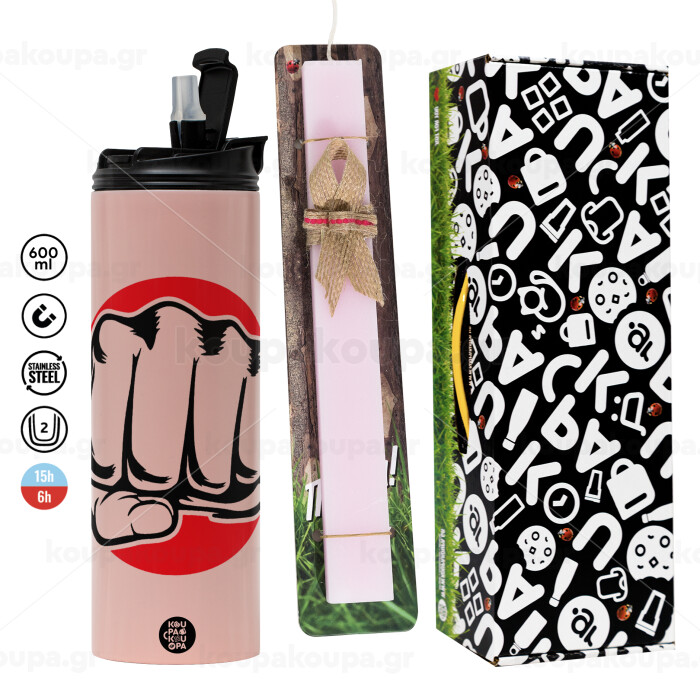 Γροθιά (punch), Πασχαλινή Λαμπάδα με ΡΟΖ Travel Tumbler θερμό (600ml, BPA free) & κερί αρωματικό πλακέ (30cm) (ΡΟΖ)