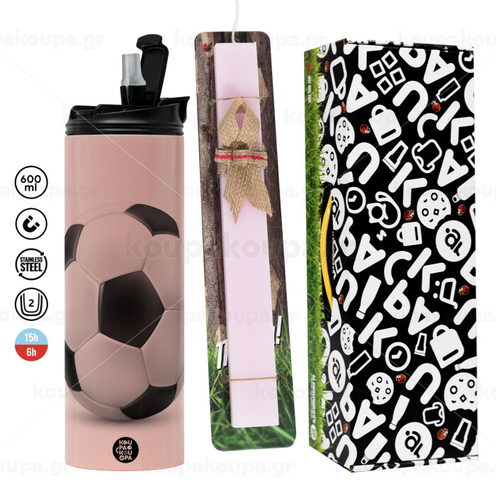 Μπάλα ποδοσφαίρου, Πασχαλινή Λαμπάδα με ΡΟΖ Travel Tumbler θερμό (600ml, BPA free) & κερί αρωματικό πλακέ (30cm) (ΡΟΖ)