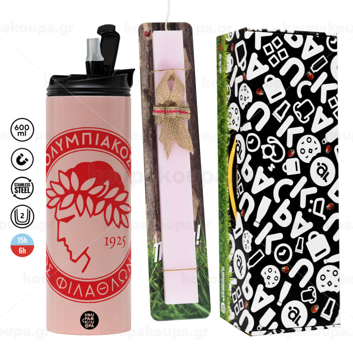 Ολυμπιακός, Πασχαλινή Λαμπάδα με ΡΟΖ Travel Tumbler θερμό (600ml, BPA free) & κερί αρωματικό πλακέ (30cm) (ΡΟΖ)