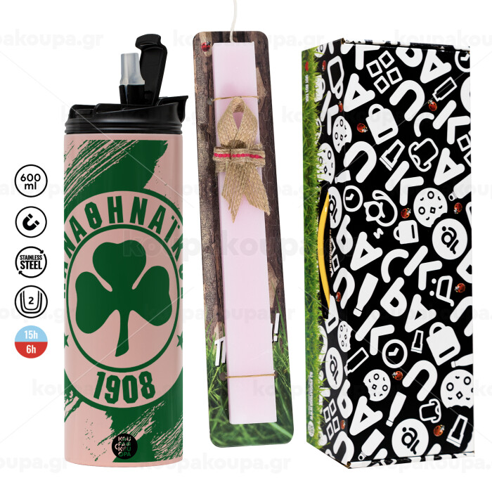 Π.Α.Ο., Πασχαλινή Λαμπάδα με ΡΟΖ Travel Tumbler θερμό (600ml, BPA free) & κερί αρωματικό πλακέ (30cm) (ΡΟΖ)