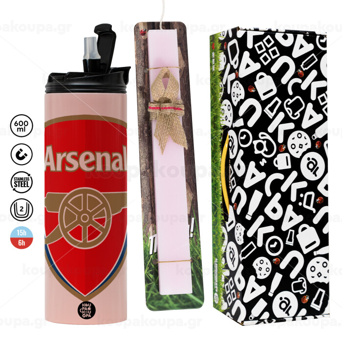Arsenal, Πασχαλινή Λαμπάδα με ΡΟΖ Travel Tumbler θερμό (600ml, BPA free) & κερί αρωματικό πλακέ (30cm) (ΡΟΖ)