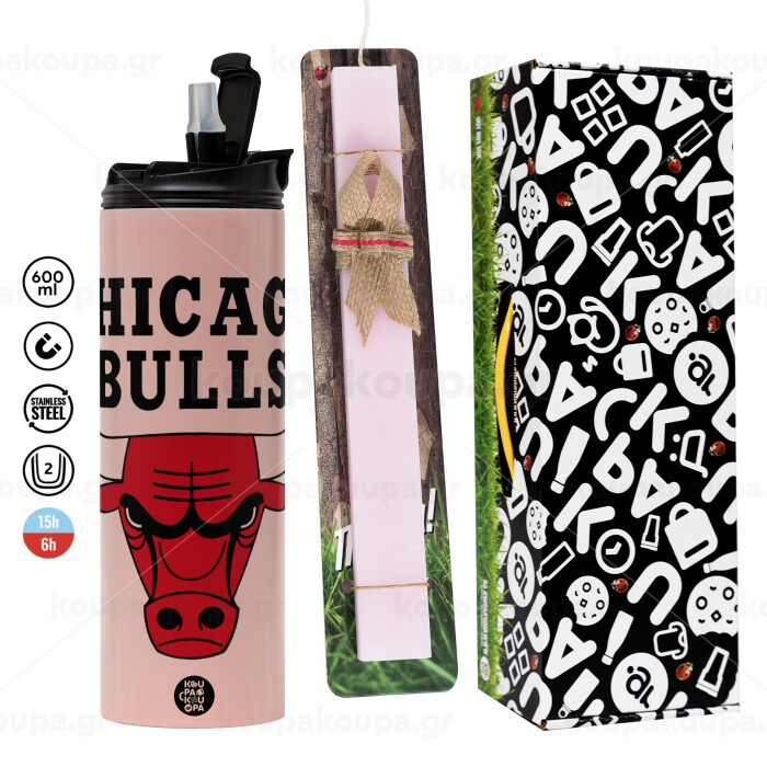 Chicago Bulls, Πασχαλινή Λαμπάδα με ΡΟΖ Travel Tumbler θερμό (600ml, BPA free) & κερί αρωματικό πλακέ (30cm) (ΡΟΖ)