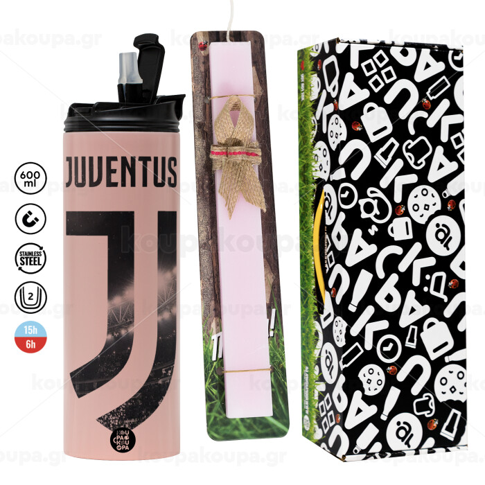 FC Juventus, Πασχαλινή Λαμπάδα με ΡΟΖ Travel Tumbler θερμό (600ml, BPA free) & κερί αρωματικό πλακέ (30cm) (ΡΟΖ)