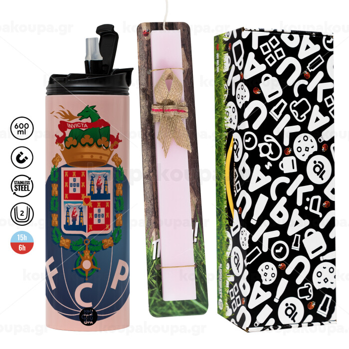 FCP, Πασχαλινή Λαμπάδα με ΡΟΖ Travel Tumbler θερμό (600ml, BPA free) & κερί αρωματικό πλακέ (30cm) (ΡΟΖ)