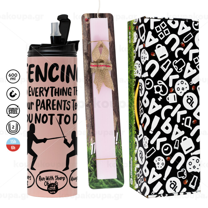 Fencing, do everything that your parents told you not to do., Πασχαλινή Λαμπάδα με ΡΟΖ Travel Tumbler θερμό (600ml, BPA free) & κερί αρωματικό πλακέ (30cm) (ΡΟΖ)