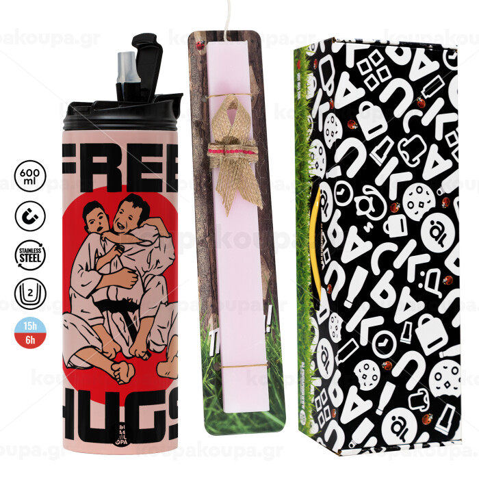 JUDO free hugs, Πασχαλινή Λαμπάδα με ΡΟΖ Travel Tumbler θερμό (600ml, BPA free) & κερί αρωματικό πλακέ (30cm) (ΡΟΖ)